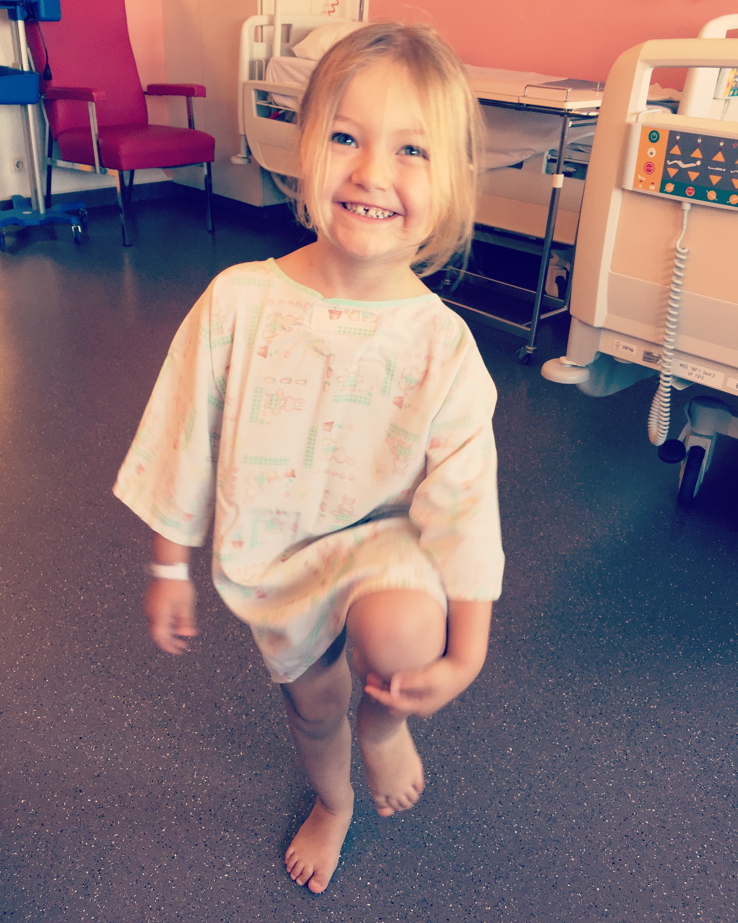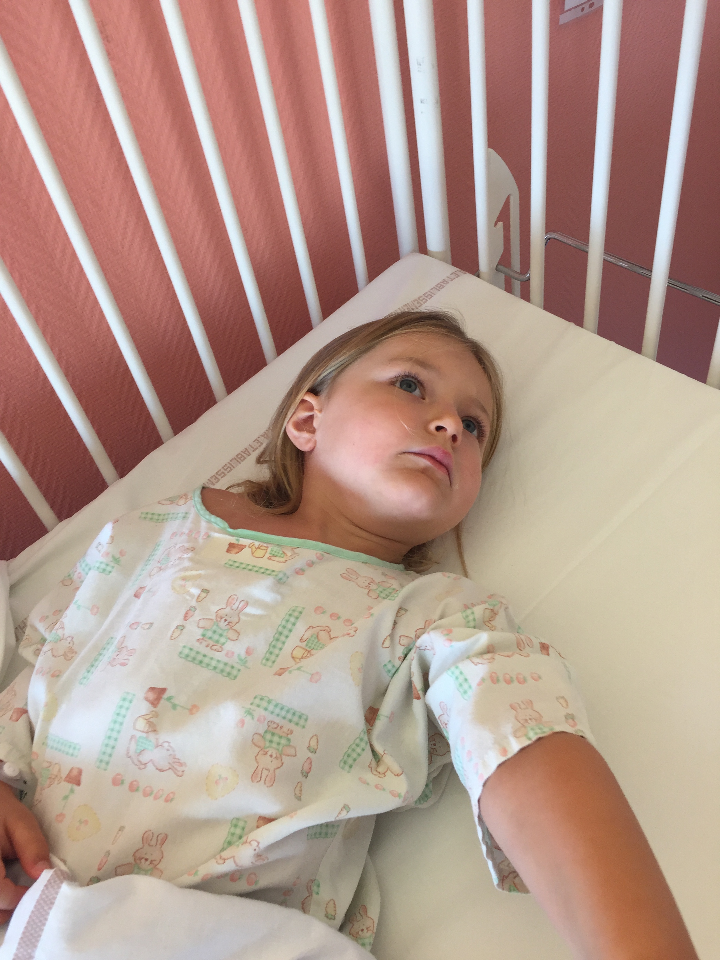 Elle est revenue du bloc un peu avant 10h. Elle était réveillée mais encore un peu sonnée. Ce qui n’a pas duré très longtemps car elle à vite eu soif et faim !