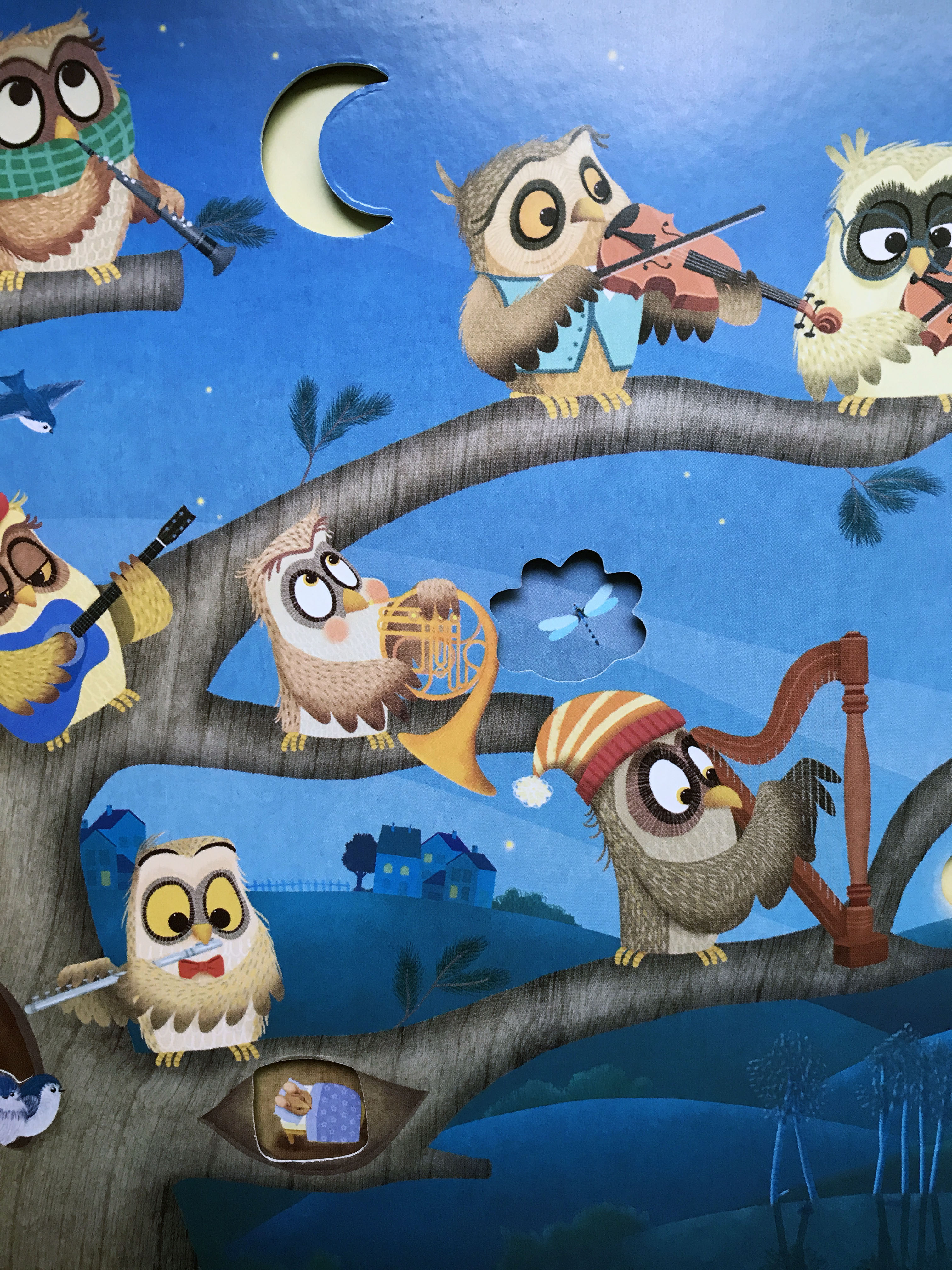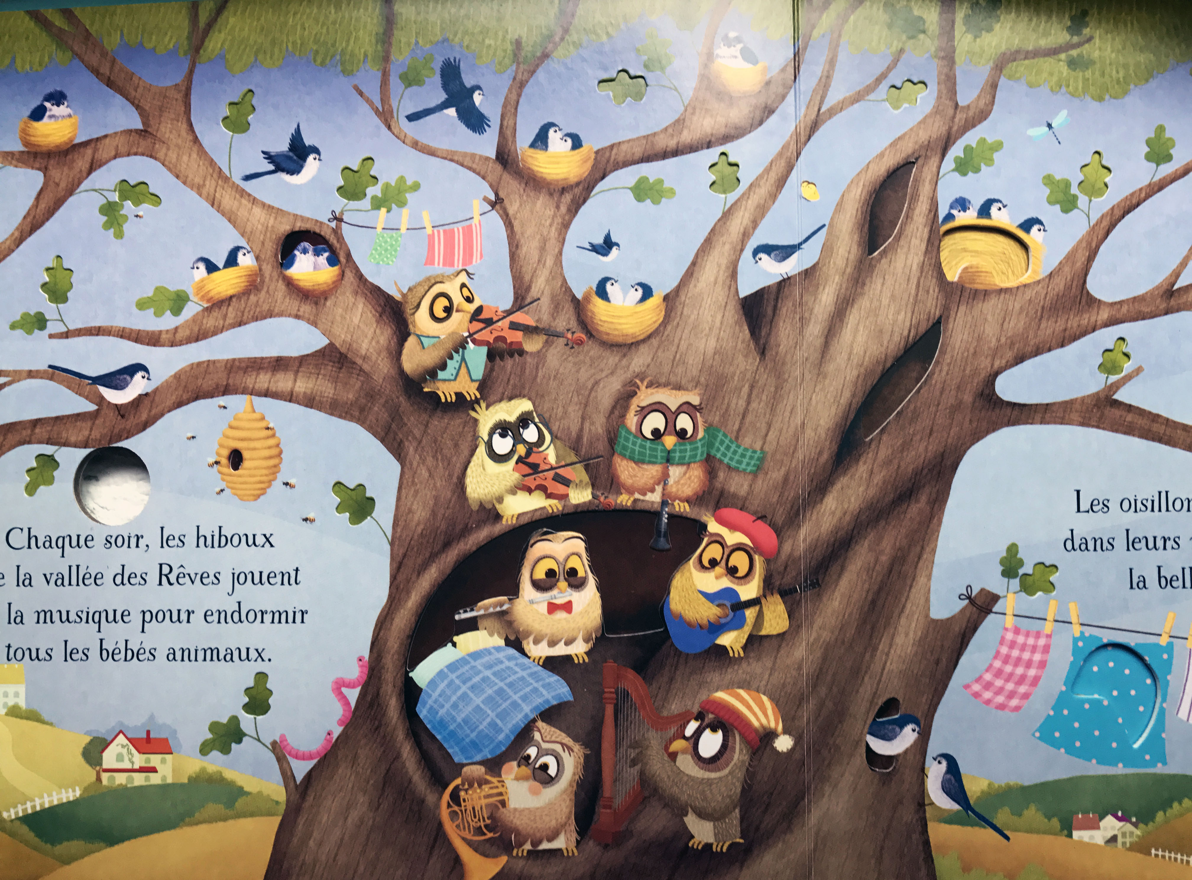 Il s’agit d’un livre sonore qui diffuse de douces berceuses pour bébé au fil des pages.